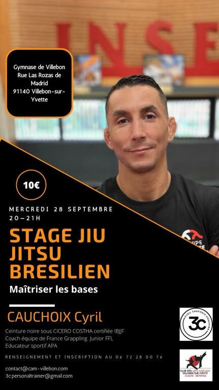 1 fois par mois le Cam Villebon vous propose un cours de jiu jitsu bresilien avec Cyril Cauchoix Cyril, ceinture noire plusieurs fois médaillé au championnat de France et compétitions internationales. Entraineur équipe de France junior de Grappling