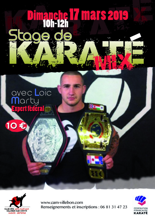 Dimanche 17 mars 2019, 10h12h, stage de Karaté Mix au CAM Villebon avec Loic Maerty Expert Fédéral - Champion du Monde BCC 77 kg 2016 - Champion du monde BCC 84 kg 2012 - Champion du monde UWC 77kg 2011 Participation au stage: 10 €