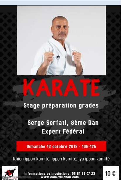 Dimanche 13 octobre 2019, 10h-12h au CAM Villebon: Stage Karaté avec Serge Serfati, 8ème Dan, Expert Fédéral